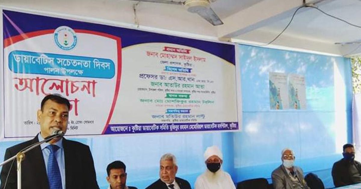 ডায়াবেটিস সম্পর্কে জনসচেতনতা বৃদ্ধির লক্ষ্যে কুষ্টিয়ায় ডায়াবেটিস সচেতনতা দিবস পালন করা হয়েছে। এ উপলক্ষে শনিবার (২৮ ফেব্রুয়ারি) সকাল ১০টায় কুষ্টিয়া ডায়াবেটিক সমিতি পরিচালিত মুজিবুর রহমান মেমোরিয়াল ডায়াবেটিক হাসপাতাল চত্বরে এক আলোচনা সভা অনুষ্ঠিত হয়। আলোচনা সভায় প্রধান অতিথি হিসেবে টেলিকনফারেন্সের মাধ্যমে উদ্বোধন করেন বাংলাদেশ ডায়াবেটিস সমিতির সভাপতি ও জাতীয় অধ্যাপক ডা. এ কে আজাদ খান। স্বাগত বক্তব্য দেন হাসপাতালের সাধারণ সম্পাদক মোশফিকুর রহমান টরলিন।